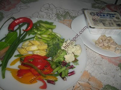 In a heat proof plate , place the tofu in the middle, Place in a circular motion broccoli,cauliflower, asparagus,baby corns, spring onions, clalamansi leaves, and lemon grass. Steam for 4 mins in rapid boiling water.Open the lid, add in capsicum, snow pea, and chicken pieces. Pour in the sauce all over the vegetables and tofu slowly. Steam for another 3 mins.Garnish with red chilli and spring onions. Serve immediately.