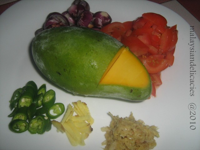 Use a claypot for best result.Heat 1 tbsp oil.Saute ginger garlic paste until fragrant.Add in all the powders and stir a few secs .Add in chopped tomatoes and stir further.Do not add oil or water.The tomatoes will let out some fluid which is enough to sauté the ingredients.Add in chopped green chillies and stir again.After a few seconds the wonderful aroma of green chillies will fill the room.At this stage , add in julienne ginger, whole shallots,cut mangoes , prawns and curry leaves. Add in ½ cup water and simmer gentle.Add in sugar and salt to taste.Finally add in coconut milk and simmer for a few mins.You can add water if you want the gravy to be more lighter.Close fire once the desired gravy is attained.Some do use tamarind juice or kodumpuli for the dish.It will give more sourish taste to the curry .Kodumpuli is something that you cant get it here in Melaka, so you can use tamarind juice if desired.Instead of coconut milk you can also grind 2 tbsp fresh grated coconut and add it into the gravy.