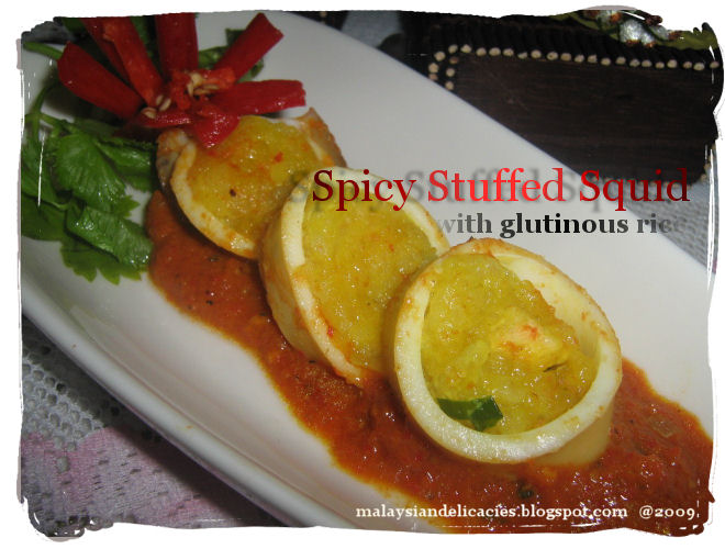 Rinse meat and tentacles inside and out under cold running water and set aside to drain. Fill into the squid the glutinous rice. Press with your index finger so that the filling is compact inside the squid. Fill in ¾ way of each squid. Close the top part with the tentacles and attached it with the use of toothpicks. You can discard the tooth picks later once its cooked.Do the same way until all the squids are used up. In a wok, heat about 3 tbsp of oil. Saute the pounded ingredients until aromatic . Add in coconut milk ,salt to taste and sugar (abt 3 tsp )and let simmer. Add in the squids and cook it in low heat ,turning the squids every few seconds.Cooking squids at high heat might let the filling come out and the squids breaking apart.Once the squids are firm and cooked , close fire.leave to cool before discarding the toothpicks with the help of a fork.