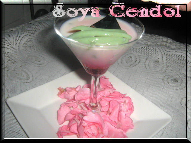 The recipe is quite easy. In a serving glass, place a tbsp of cendol , pour in soya bean milk,in swirl motion add in palm sugar syrup and rose syrup each spoonful.