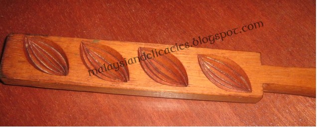 Coat the buah kana mould with flour and knock out excess flour,place a bit of the dough in the mould and knock out slowly from the mould the dough.