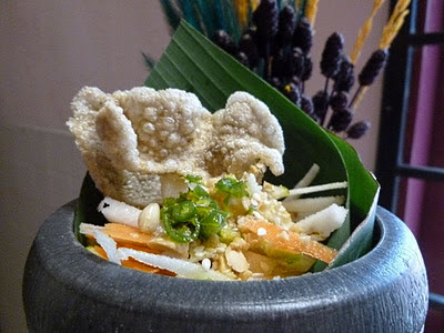 In a bowl place all the vegetables, pour in the dressing, and garnish on top with sesame seeds and peanuts.Place the crackers at the side. You can serve extra dressing on the side.