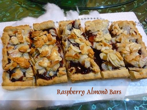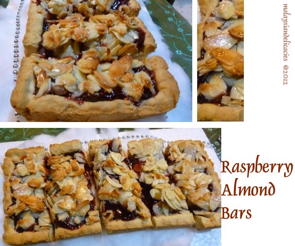 The recipe comes from Anna Olson.She used cherry jam but I replaced it with raspberry,you can vary it with strawberry as well.The crust was rather crumbly ,therefore be careful in handling after baking.Do not be generous on the jam ,as too much jam will make it ooze out while cutting.I have been rather generous in using the almond slices.One cup is sufficient enough.A beautiful treat for tea time.