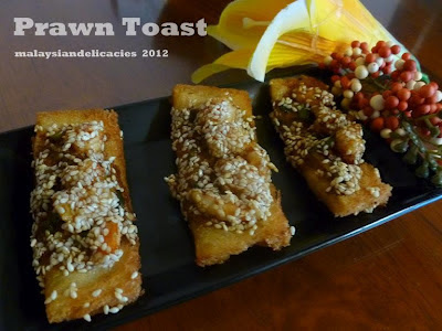 Take a small bread ,and place the prawn filling in the middle.Coat all parts with sesame seeds and deep fry. As you place the bread ,it will slowly turn and cook .Fry for a bit until the bread turns golden brown.Do the same with the rest of the bread until you finish the filling.