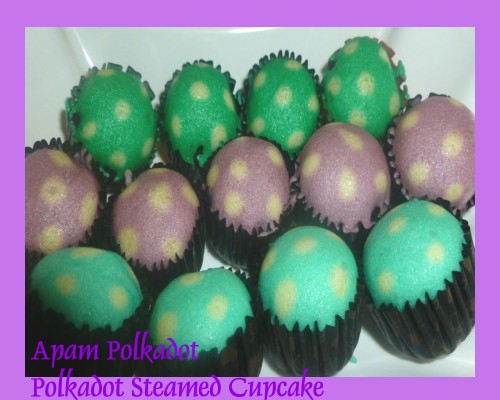My first attempt in making Polka dot steam cup cake came out well however I was not satisfied with the texture.The fluffy ness did not stay long. This recipe is another version which I tried out recently. There are a few changes that I have done .When I did the apam for the first time I used superfine flour, normal sugar and omega 3 eggs.I did not place any filling to the apams.I did them medium size .