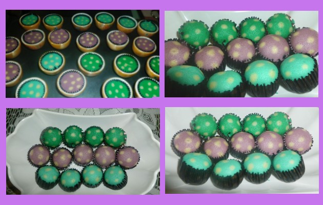 Make a small hole in the piping bag.Slowly make dots .It will spread after a few seconds .Its up to you what colour combination that you want to use.I have used three different colours:green,blue and purple and the polkadots had been retained with the original colouring.