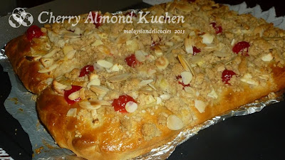 Note: After doing this delicious kuchen , I think there is only one change that I will make when I bake it again, which is the topping. I rather not have the crumble as it actually disturbs when you bite into it. Rather , I prefer to sprinkle on the apples with some sugar and cinnamon mixture,then top with cherries and almonds.Once baked, glaze it with