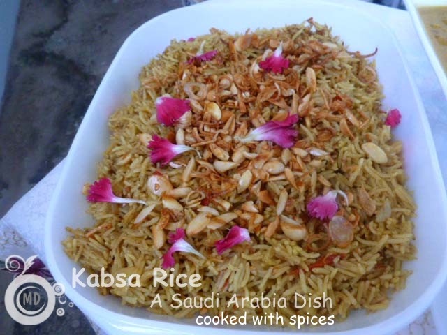 The first recipe comes from the Saudi Arabia , being Kabsa Rice.Kabsa is a family of rice dishes that are served mostly in Saudi Arabia — where it is commonly regarded as a national dish. Fragrant basmati rice is topped with chicken pieces or meat cooked in a tomato sauce with aromatic spices, and garnished with toasted or fried slivered almonds .There are many kinds of kabsa and each kind has a uniqueness about it.Many parts uses par boiled rice to make kabsa but basmati rice is also equally favoured as well.