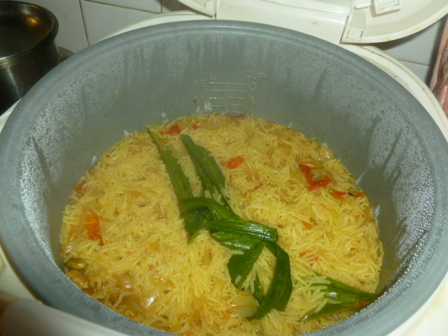 Add in washed rice and combine with the spices.Spread the rice evenly in the rice cooker.Place the knotted screwpine leaves in the middle.Pour in sieved chicken stock into the rice,. Do Not stir the rice with the stock.This will prevent the rice from turning mussy. Cook until rice is done. Garnish with shallot crisp and fried almonds.