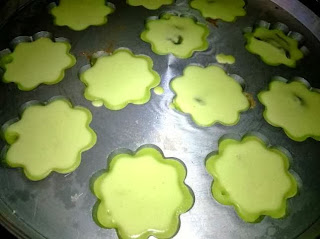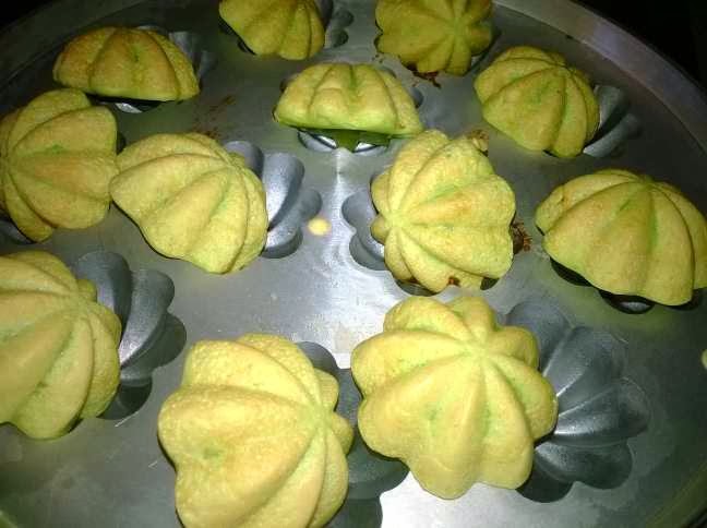 Kuih cara is made up of flour, egg, and coconut milk . The mixture is mixed thoroughly before being cooked in a special mold until it hardens. There are sweet and savoury kuih cara available The savoury usually has some spiced chicken or beef added whilst the sweet ones have sweet filling in them . The kuih I had prepared today is soft with pandan flavour and pandan kaya as filling. You can use any type of sweet filling which you prefer.