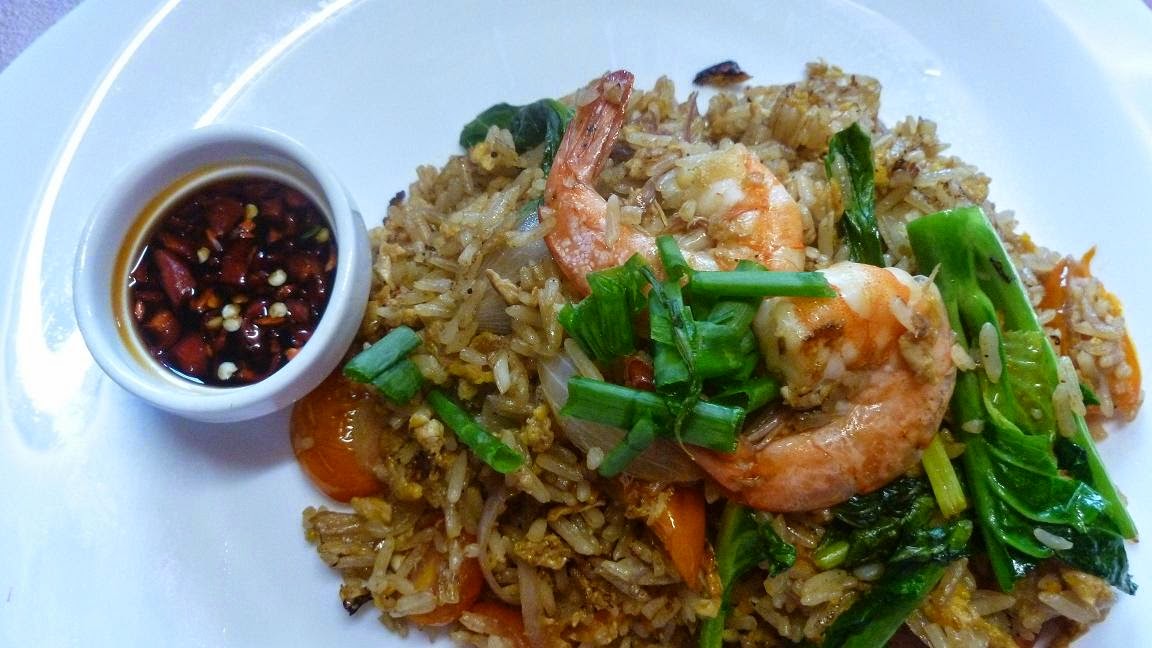 Heat the pan and pour 2 tbsp oil with the sesame oil. Saute garlic until aromatic, add in onions and prawns and sauté further.Add in kalian leaves ,tomatoes and the sauces.Dish all the ingredients to the side , and in the centre pour in the beaten egg. If not enough oil, you can add abit more for the egg to cook.Slightly scramble the egg , then add in the cooked rice. Stir the rice until well combined with all the ingredients. Add in aji no moto, pepper powder .Dish out.Garmish with chopped spring onions. Cut some red chillies and mix it with some light soya sauce.Serve it with the fried rice.