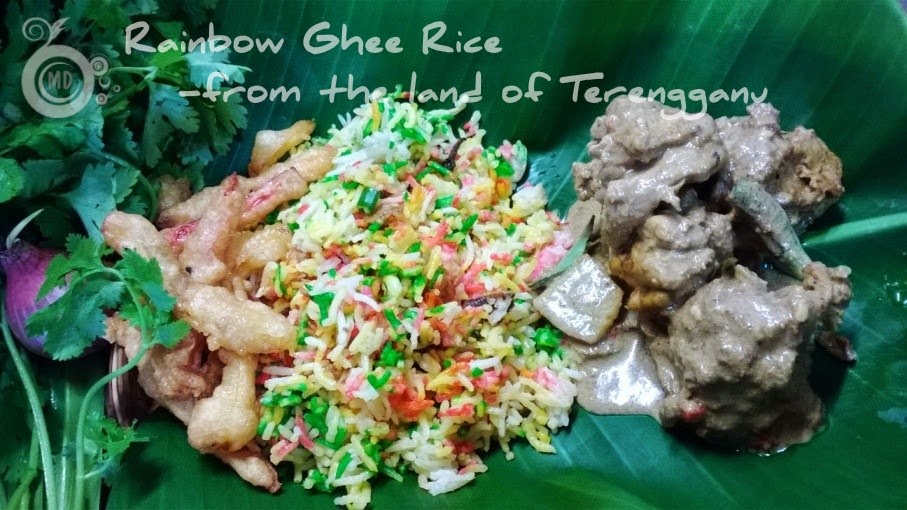 The Nasi Hujan Panas is a Nasi Minyak of Terengganu or Ghee rice .This rice is prepared with both ghee and margarine .You can fully use ghee as well ..No problem!