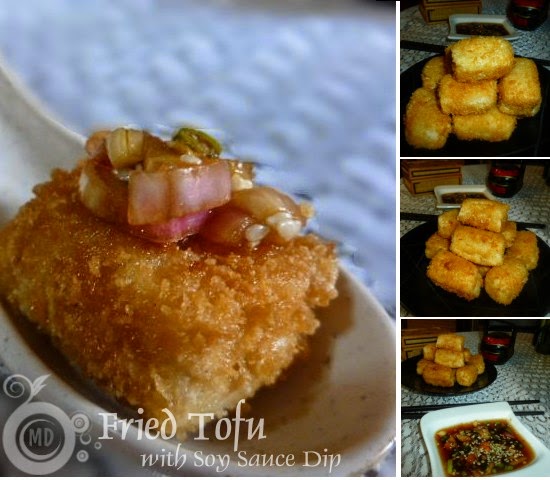 6. Place all the tofu cubes into the skillet. When one side browns, flip it over to another side. Repeat until nicely browned. Remove from skillet and drain on paper towel. Serve hot with sesame-soy dipping sauce.