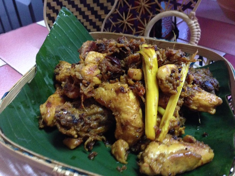 Heat about 4 tbsp oil, Saute the pounded ingredients and bay leaves lightly. Then add in chicken and turmeric powder. Mix to combine all the spices with chicken. Then add in galangal, tamarind juice and coconut water. Stir until sauce thicken. In between add in 2 tbsp oil and stir. Close lid and cook in medium flame. Ensure that you stir the dish occasionally every 3 mins or so. Add sugar and keep frying the chicken. Do not leave the dish unattended as it will burn . Open lid every 3 to 4 mins to stir the chicken . Fry until chicken turn brownish and dry . Serve as a side dish with rice.