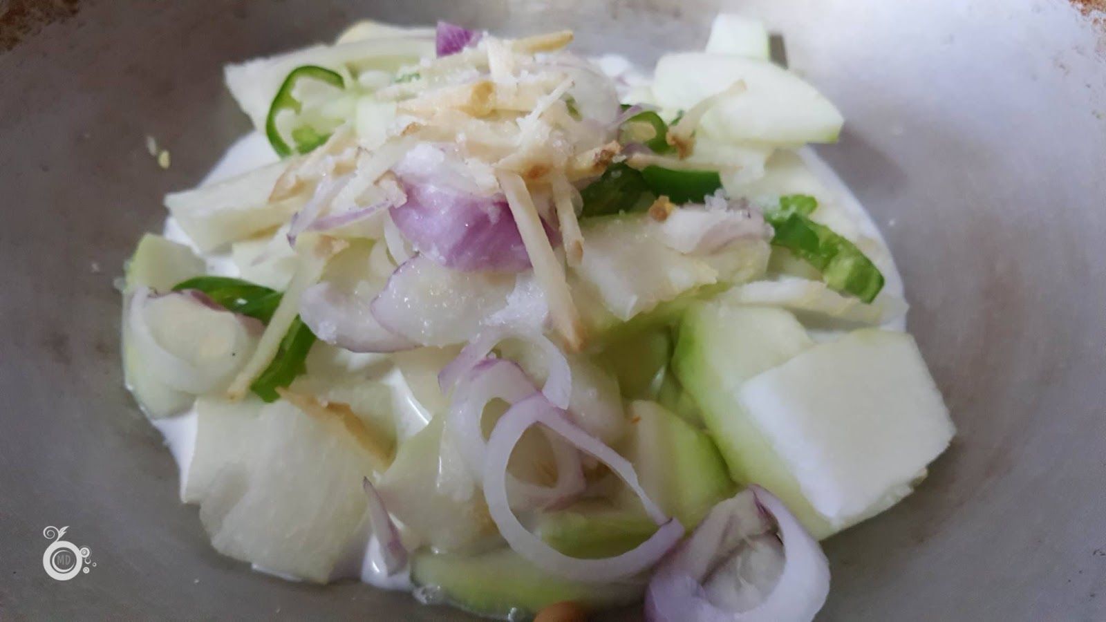 De-skin the ash gourd, discard the middle part and slice about 1 cm thickness. In a wok , place the ash gourd, onions, green chillies, ginger and cow peas. Pour the light coconut milk. Add a bit of salt. Mix all the ingredients. Close lid, and cook in low heat so that the coconut milk do not break. Stir occasionally.