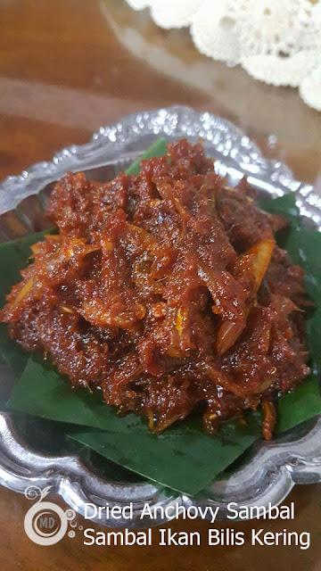 Heat about 1/2 cup of oil, saute the pounded ingredients in low flame. In between add in sugar and saute further. Add in salt and the anchovies, tamarind juice. Keep stirring in low flame until the sambal paste is dried. Becareful, do not leave unattended, then the paste will have a burnt smell.