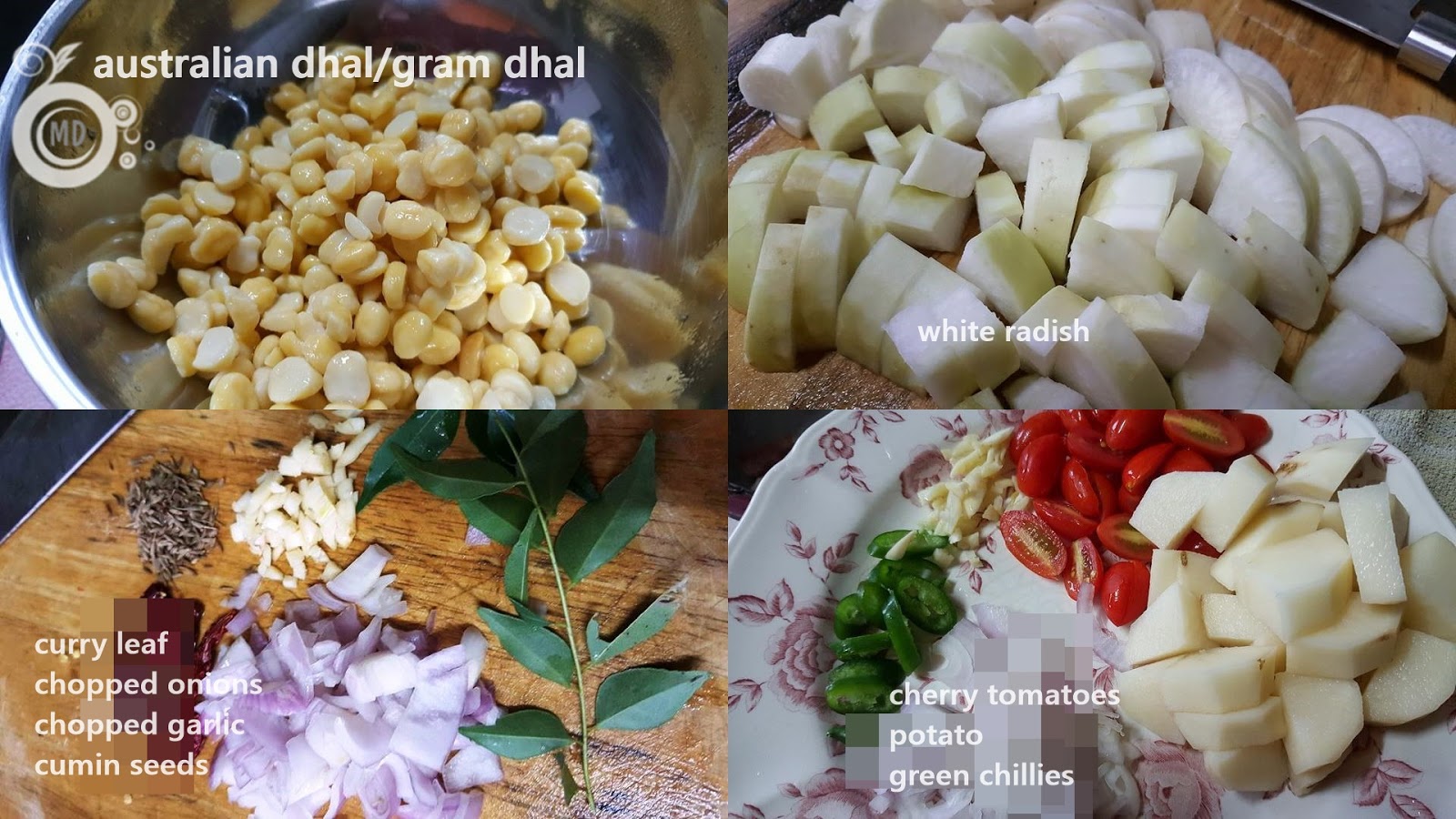 Heat wok with 3 tbsp oil. Saute garlic, onions and half of the curry leaves, until onion soften. Add in the white radish and green chillies and stir fry for about 2 minutes. Then add in potatoes, australian dhal, along with the water that was used to soak the dhal. Stir lightly, mix in turmeric powder, sambar powder and cumin seeds. Add some water and leave to simmer gently. Close with a lid. Add in the tomatoes and salt to taste, 10 mins before closing fire. Thicken the dish slightly and finalize with adding the reminder curry leaves. Dish put and serve as a side dish.