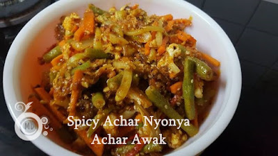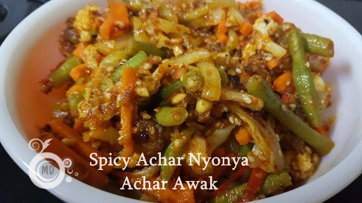 In a big bowl, mix carrot cucumber mix, blanch vegetables, red chilies and toss it with the chili paste. Mix in sesame seeds, shallot crisps, and grounded peanuts, I love the crunchiness of the peanuts, therefore, I have added more, you can lessen it. Toss all the ingredients until they are well combined. Keep in a ceramic bowl with airtight lid or glass bowl with lid (make sure air tight) and refrigerate the achar at all time. Serve as and when required. This achar is best prepared a day earlier before serving. It is commonly known as Achar Awak, an achar famous among Peranankan or Penang Nyonyas.
