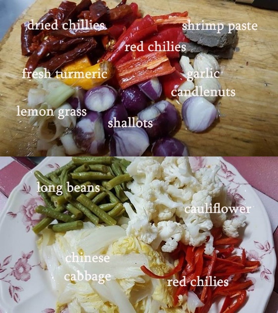 Separately, boil Ingredients B. Blanch each vegetable(cauliflower, long beans and cabbage) separately, drain and pat dry and keep aside.