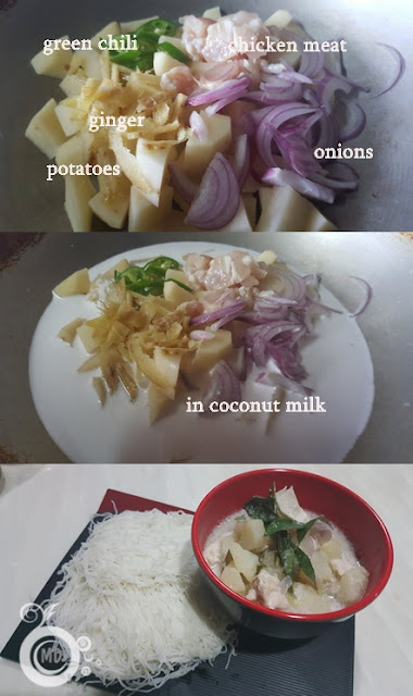 In a wok, add in potatoes, sliced onions, ginger, green chili and chicken meat. Pour in 3/4 of the coconut milk into the wok. Simmer with the lowest heat. Close with a lid, stir occasionally so that the coconut milk does not break. Simmer until the potatoes are cooked. Season with salt. Finalize by pouring in the balance coconut milk. Once one or two bubbles appear, close heat. Throw in the curry leaves and add 1 to 1 1/2 tsp of cooking oil.Do not stir. Close with a lid and leave the stew for about 15mins. After 15mins, stir and taste to adjust seasoning. Some houses do add a pinch of turmeric powder, however am sharing my mum's recipe.
