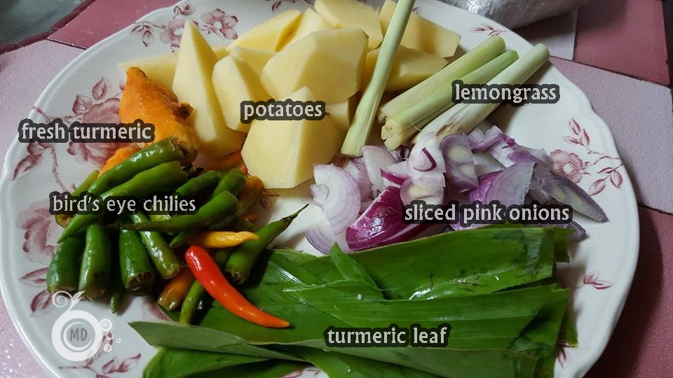 Then add in thick coconut milk and turmeric leaves. Add salt to taste. Dish out and serve with white rice.