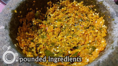 Pound bird's eye chilies, fresh turmeric until fine. Add a pinch of salt when pounding. Keep aside.