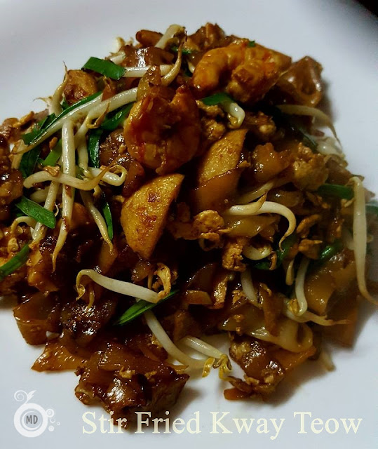 Heat a pan, saute garlic slightly, then add in fish cakes and prawns. After a minute or so, add in kway teow and stir fast, then add in the sauces, sugar, and salt. Stir for a few minutes until sauces are well combined, slowly push all the ingredients to the side of the wok, add a bit of oil, then pour in beaten egg, leave for a minute, stirring occasionally the egg, slowly place the kway teow on the egg, leave for a second, then quickly give it a stir. Add in bean sprouts and chives. Give a quick stir and dish out.