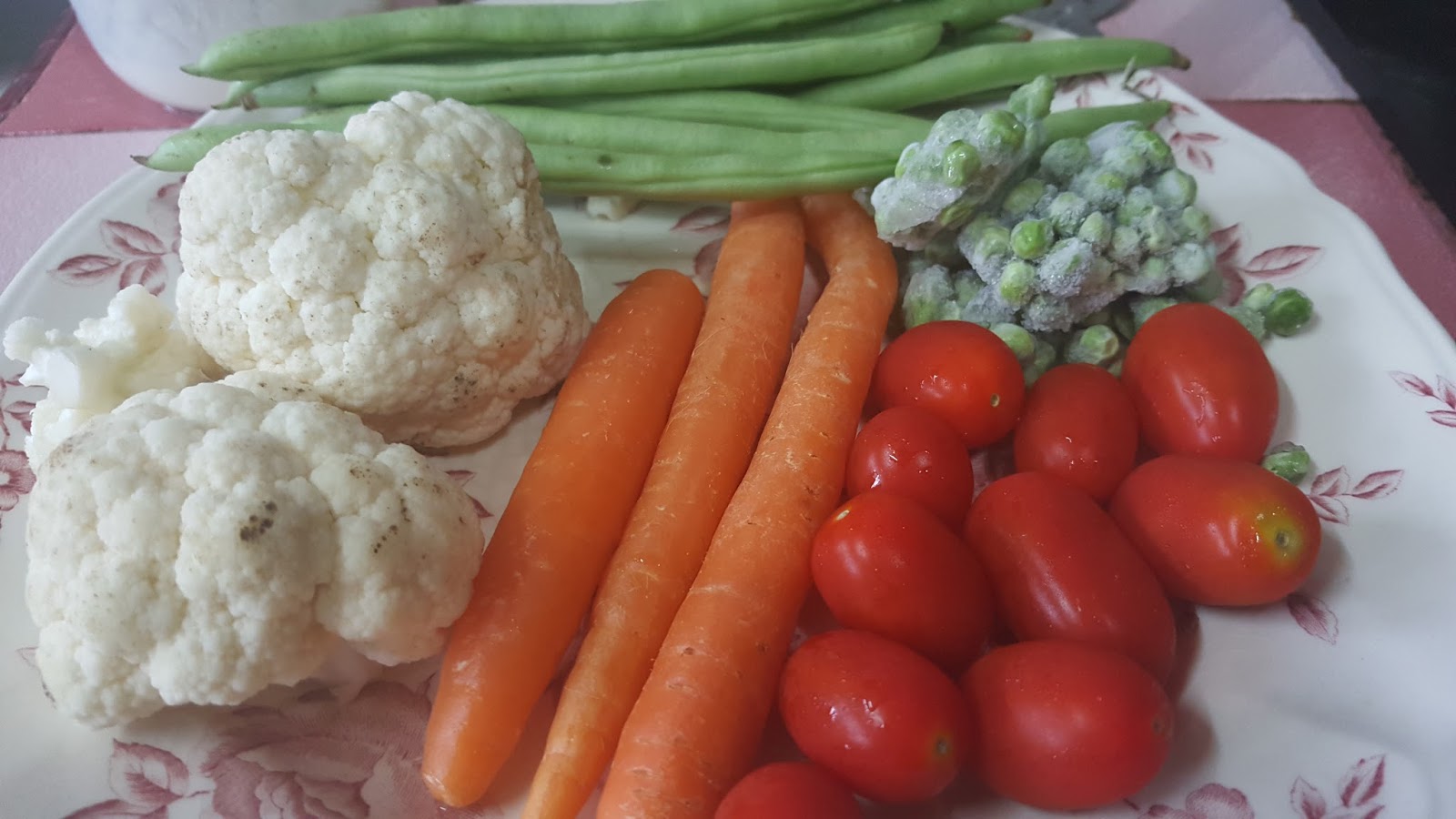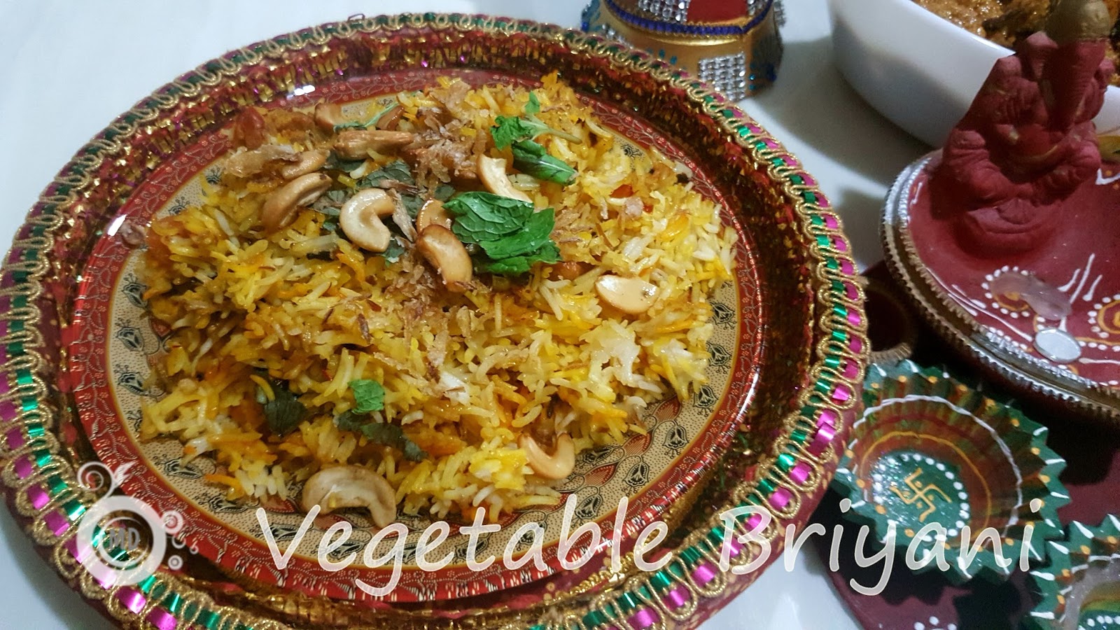 Meanwhile, in a wok, heat about 3 tbsp water, saute spices, saute further, add shallot crisps and give a few stirs, followed by ginger garlic paste, mix well, then add in cut vegetables. Mix to combine with the spices, to it add in chilli powders and turmeric powder. Stir well.Add in grounded almonds and stir, add salt as well.Close and cook until vegetables soften. Stir in between to avoid burning the ingredients. If dried, sprinkle some water. Spread the rice which had been added with colourings on the vegetable masala. Garnish with mint and coriander leaves, shallot crisps and cashew nuts. Cover with banana leaves and close with a cover. Cook for 10 to 15mins. Close fire.