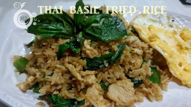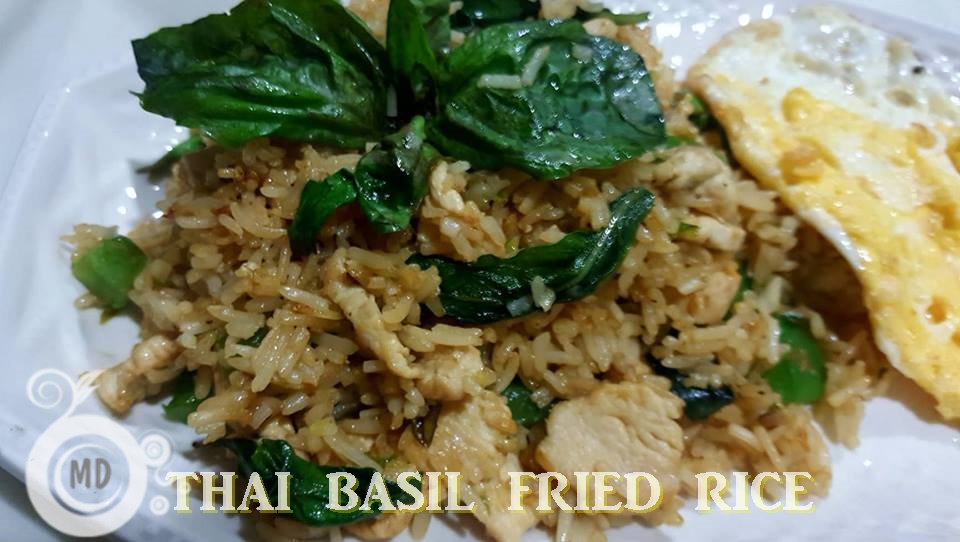 Pound chilies and garlic until fine. Keep aside. Heat a wok until smoky, then add in 2 tbsp oil. Add in chicken slices and fry it partially. Then add in pounded ingredients, and saute until aromatic. Mix in cut capsicum and cook further until soften. Then add in cooked rice, white pepper powder, sauces, andstir-fry. Add in sugar as well. A few minutes before closing fire, add in basil leaves. Mix to combine and until leaves are softened. Cook until rice is dried and all ingredients are well combined. Dish out. For egg, heat a wok, and pour in 2 tbsp oil, once smoky, slowly break the egg on the hot oil, and leave to cook. Turn and leave to cook further. Fry until desired firmness is obtained. Serve with fried rice.