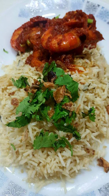 Wash and soak basmati rice for 20mins. Drain in a colander. I made my rice in a rice cooker. I placed the rice pot on low heat in a stove. Heated the planta margarine, then add in the spices and stirred for a while, then mix in the grounded paste. Saute until the spices turn fragrant. Then, add 2 cups of water. Pour in evaporated milk and throw in screwpine leaves. Add in salt and rock sugar. Leave to boil. Once boiling, mix in the drained basmati rice. Give a stir. Leave to cook until half cook. Then top with some chopped coriander and mint leaves. Top with some shallot crisps. Then transfer the pot into the cooker. Leave to cook until it turns to warm. Finalised by topping with more chopped coriander and mint leaves and shallot crisps. Serve with chicken or mutton dishes.