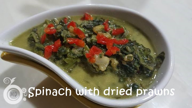Wash and rinse the spinach. Cut the spinach into small parts. In a wok, heat 1 tbsp oil, saute chopped garlic, followed by onion and green chilli. Then add in dried prawns and saute for another one minute. Then add in spinach, give a few stir. Lower the heat and pour in thin coconut milk. Leave the spinach to cook in the coconut milk. Close and leave to cook gently.