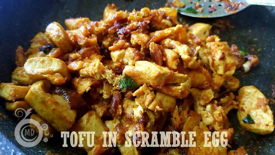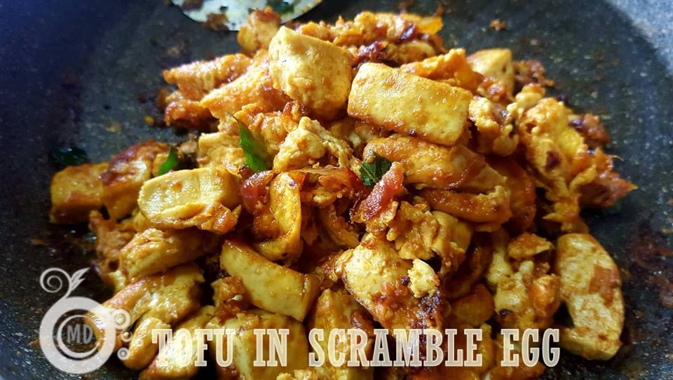 Add sugar about 2 tsp and salt to taste. Stir to combine and dissolve. Add the tofu and mix to combine the chili paste. Spread the fried tofu on the pan, slowly pour the beaten egg all over the tofu, leave for a few minutes. Then slowly start scrambling the egg with the tofu. Stir until dried.Sprinkle with chopped spring onions or curry leaves. Serve as a side dish with rice.