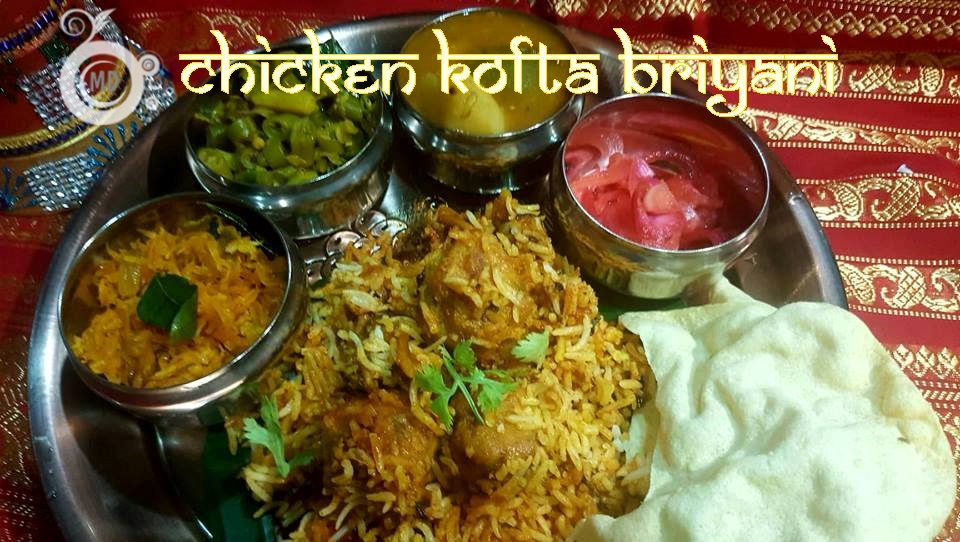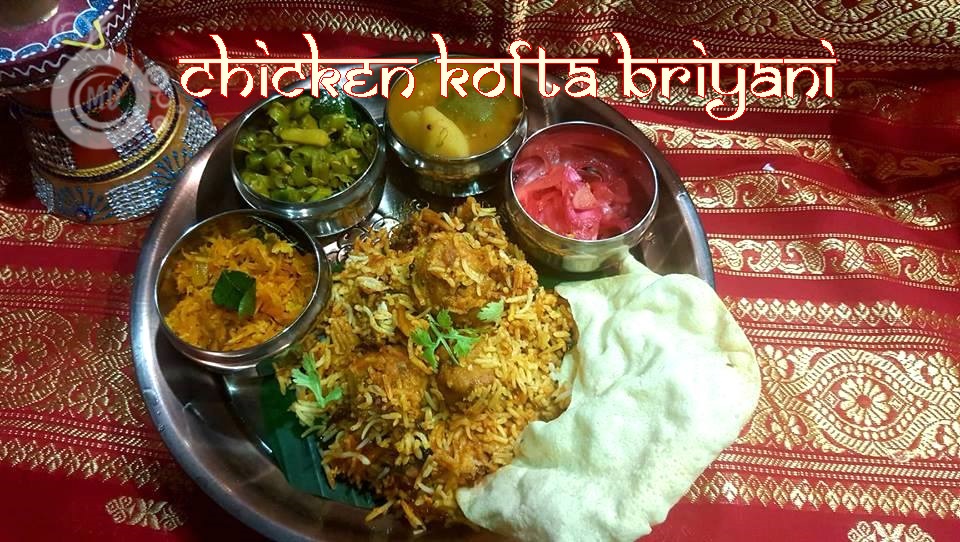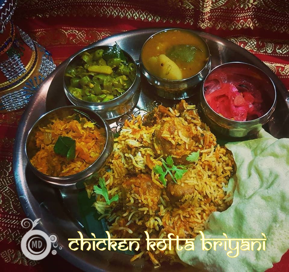 and spread with the koftas with some gravy, sprinkle some chopped mint and coriander leaves, and shallot crisps, then again spread the 2nd part of the rice, finish off all the koftas and gravy, sprinkle with chopped mint and coriander leaves, sprinkle shallot crisps, and almonds. Finally top with the last part of the cooked basmati rice, sprinkle with chopped mint and coriander leaves, melted ghee, saffron , fried shallots/crisps and almonds. Cover with a banana leaf. Close lid and cook for 10mins in low flame. Once cooked, close fire. I served the kofta briyani with Vegetable Dalca, pickled onions, veges and papadam.