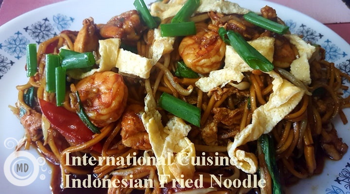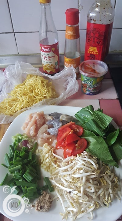 Heat 2 tbsp oil, saute chopped garlic until fragrant, add in chicken and prawns and stir until meats cook. Break in the shrimp paste in the wok, stir, add in chili paste as well. Stir well. Then add in noodle and stir fry further. Add in the sauces, and stir fry all the ingredients so that it gets mixed well with the sauces. Throw in bean sprout, bok choy, cherry tomatoes, salt and sugar, and the fried egg strips. Stir and adjust seasonings. Dish out and garnish with chopped spring onions before serving.