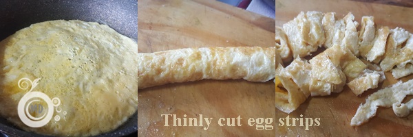 In a non-stick pan, add a tbsp of oil and turn the pan so that the oil coats at all parts. Pour the beaten egg and turn the egg mixture so that it sticks and cook. Cook on low heat just until the egg is set - this should only take a minute or so. It's done when the edges are dry and the top is just about cooked. Loosen up the edges with a spatula, then flip the pan upside down onto a plate - the omelet should flop out, like a crepe. Roll it out in a flat surface and thinly slice into strips. Keep aside.
