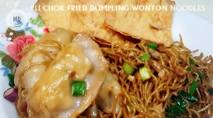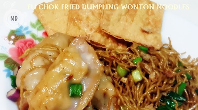 Place a skillet in a stove, heat about 3 to 4 cups of water.  Entangle the wonton noodle and stir into the hot boiling water. Cook the noodles for about 3 to 4 minutes, stirring at all times. Then place the noodles into a siever or strainer and rinse in cool water in a fast mode. Return back the noodles to the boiling water and cook for another minute. Then transfer the noodles to the dumpling pan. Mix in the sauces except for sesame oil. Combine the ingredients well in a fast mode. If the dish is too dried, add in about 4 to 5 tbsp of water or chicken stock, depending on the required gravy you want. Taste and adjust sugar and salt. You can add dark soy sauce if desired but I have omitted it. Mix in chopped spring onions and give a quick stir. Close fire. Finally, mix in sesame oil and combine all ingredients well. Transfer to a shallow serving bowl/plate and garnish with some shallot crisp, more spring onions, place the fried fu chok at the side. Serve with pickled green chillies at the side. Yummy Yummy!
