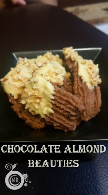 Melt the chocolate in a double boiler, dip the end part of a cookie with white chocolate and sprinkle with almond nips. Leave to cool before storing in an airtight plastic container.