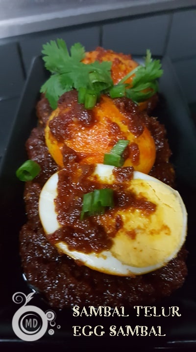 Dish out. Add around 4 tbsp oil in the same pan. Add in ingredients B and stir fry until aromatic. Add in tomato puree, tamarind juice, salt and sugar to taste. Stir and simmer gently until oil floats on the surface of the sambal paste. Mix in the eggs with the sambal paste. Adjust seasoning and serve in a serving dish. Garnish with chopped spring onions. Serve as a side dish with white rice or biryani.