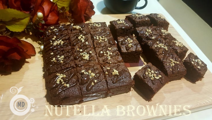 Preheat the oven to 180C and place baking paper in your brownie tin. In a large bowl, add the melted butter, brown sugar, salt, baking powder and vanilla extract. Mix well with an electric hand mixer. Add eggs one at a time, and mix well for roughly 3 minutes until well combined. Add Nutella to the egg mixture and beat until light and fluffy. Place the flour and cocoa powder in slowly and mix until well combined. Pour the mixture into the prepared brownie tin and place in the oven for 35-38 minutes. Take out and place on a wire rack to cool. Cut into desired brownie sizes, and decorate with melted chocolate and roasted almond nips.