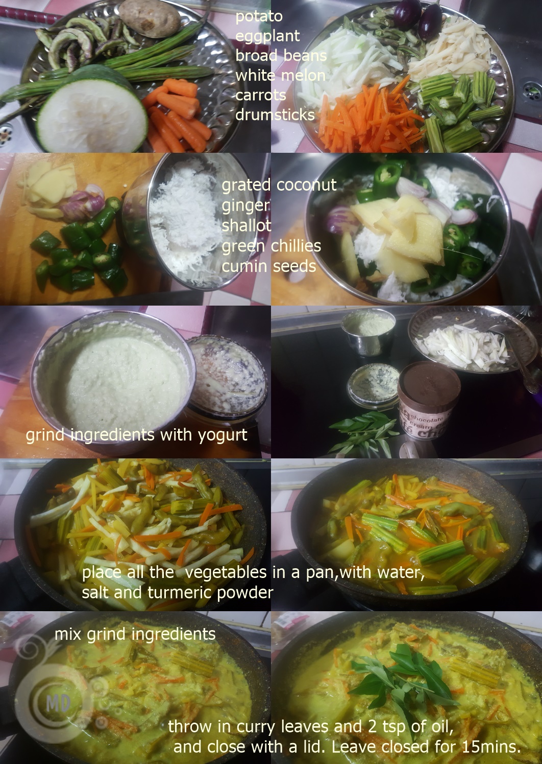 In a pan, add in cut vegetables except for white melon(as it cooks faster, add it towards the end). To it mix in about 1 cup water, turmeric powder and salt. Spread the vegetables. Close with a lid and cook on low heat. Once the vegetables are three quarter cooked, mix in white melon and stir. Leave to cook for another 4 to 5mins. Mix in grind coconut and salt to taste. Stir well. Once a few bubbles start appearing, close fire. Throw in curry leaves and pour in a circular motion about 2 tsp cooking oil/coconut oil. Close with a lid and leave for at least 15mins before dishing out.