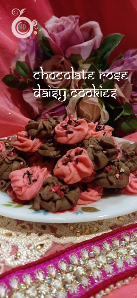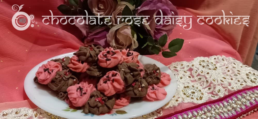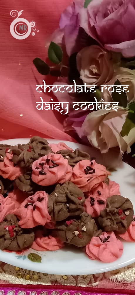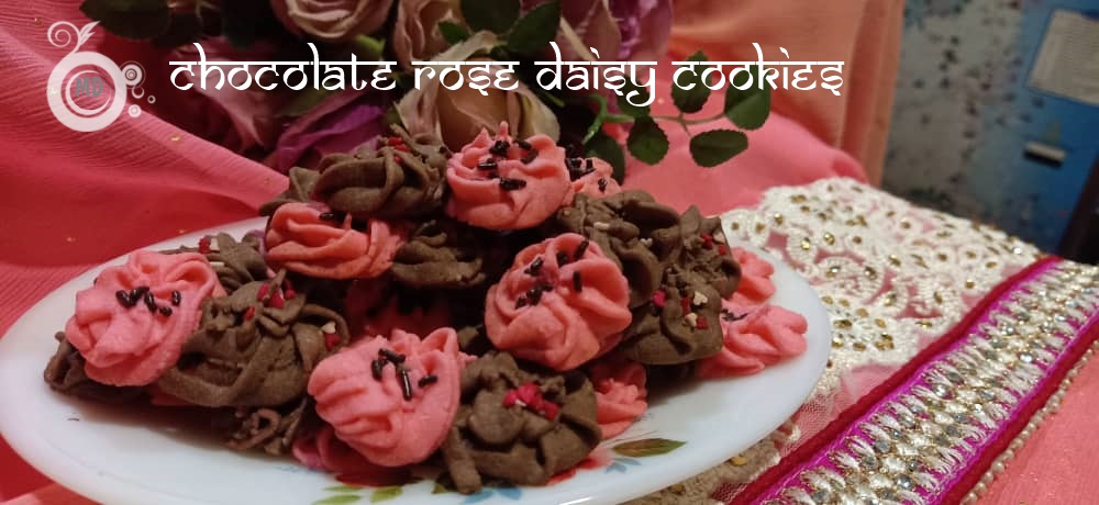 Take chocolate part of the dough and make a daisy design using a biscuit pump. Do until all the dough finishes. Then fill in the pink dough and pump daisy design close to the chocolate dough. When baking both coloured doughs will stick. Decorate according to personal preferences. (Use a biscuit pump to get daisy design.)