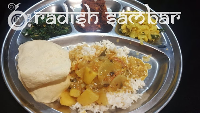 In the same pan, heat about 3 to 4tbsp oil. Add in mustard seeds, dried chillies, cumin seeds, fenugreeks seeds and curry leaf. Stir for a while until mustard seeds start spluttering. Then, add in chopped onions and saute further until the onions turn brownies. Throw in chopped tomatoes and stir further until it turns slightly mushy. Then pour in the cooked dal, and give a stir. Once it starts boiling, add in cooked radish, potatoes, turmeric powder and sambar powder. Mix in tamarind paste as well. Give a few stirs. Add in salt to taste. Pour in about 2 cups of water and leave to simmer gently. This will ensure the raw taste of the sambar powder is not there. Simmer until potatoes have softened. Adjust the consistency of the sambar that you want with adding water or reducing the liquid. Close fire.