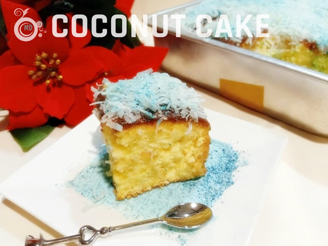 Mix ingredients B in a bowl. Take out the baked cake and poke it with a fork all around. Then pour ingredients B all around the cake. Sprinkle with the coconut flakes. Dust with blue icing sugar all around. Cover and refrigerate for 3 hours or overnight before serving.