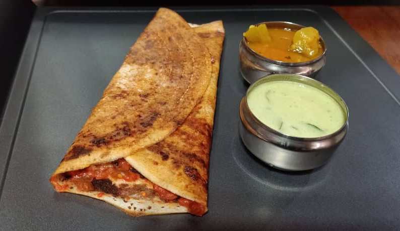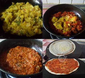 Take a ladleful of dosa batter and move in a circular motion on a Tawa or flat pan. You can drizzle some oil if you wish at this stage. Once the edges turn slightly brown, spread the potato masala on the dosa. Leave the edges to turn crisp, then fold it in half or three parts and serve with curry and mint/coriander chutney.