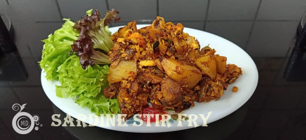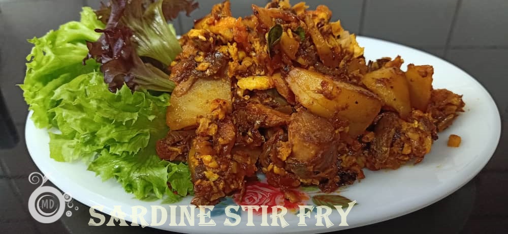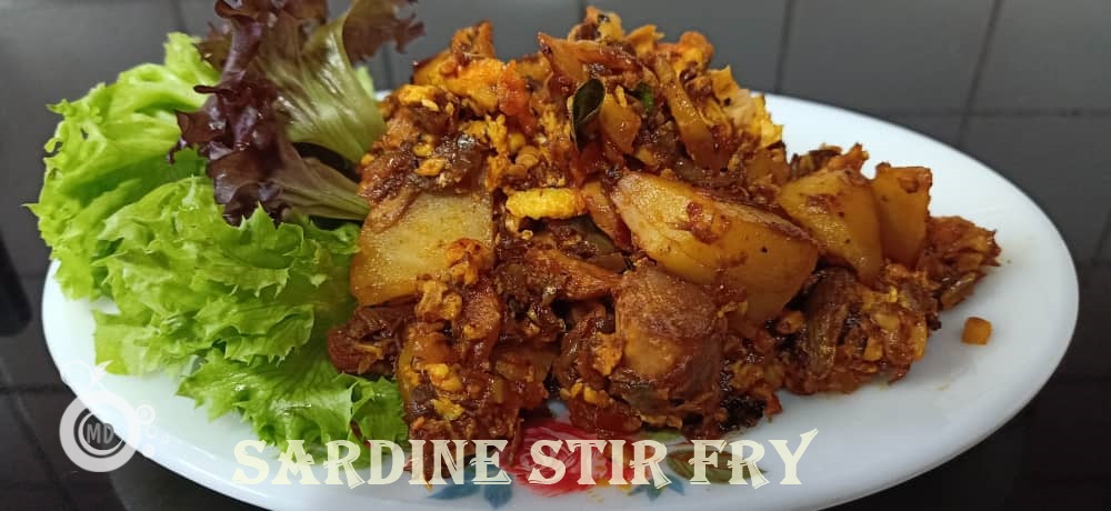 Heat 3 tbsp oil, add in the cinnamon stick, chopped onions, garlic, ginger and saute until onions turn brownish and aromatic. If you are adding potato, add in between when the onions are browning, stir fry the potatoes until the onions turn light brown. I usually use Washington potatoes, so it usually cooks fast. Add in chilli paste and saute for another 1 min. Then mix the sardine in tomato sauce. Stir, and do not break the fish for now. Mix in 1/2 cup water and let it simmer gently until the potatoes are cooked. Once the potatoes, soften, break the sardine fish into smaller pieces. Pour the beaten egg all around the sardine covering it. Leave for about 1 min, then start scrambling the sardine with the egg. Throw in some curry leaves and keep stirring until the dish is dried. Close fire. Serve as a side dish with white rice. You can also use it as filling for sandwiches by omitting the potato. The image below shows the sardine that I used for this recipe.