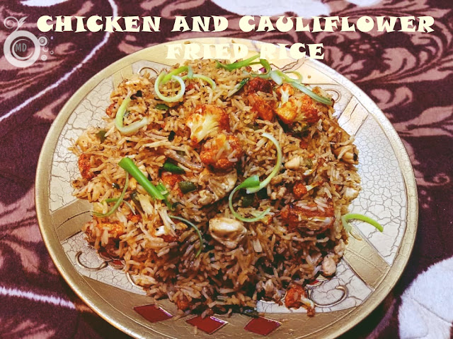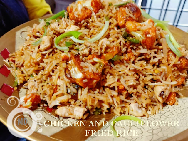 In a wok, heat about 3 tbsp oil. Saute the chopped onions, followed by ginger garlic paste. Once aromatic, add in chicken pieces, followed by slit green chillies, and capsicum. Stir until the chicken and capsicum are cooked well, then add in cooked rice. Stir fry the ingredients together to ensure they are incorporated well. Then mix in the sauces (tomato sauce, chilli sauce, and dark soy sauce). Stir the sauces well with the rice. Throw in the fried cauliflower as well. Combine well and add salt and sugar to taste. Dish out and garnish with chopped spring onions. Serve hot.