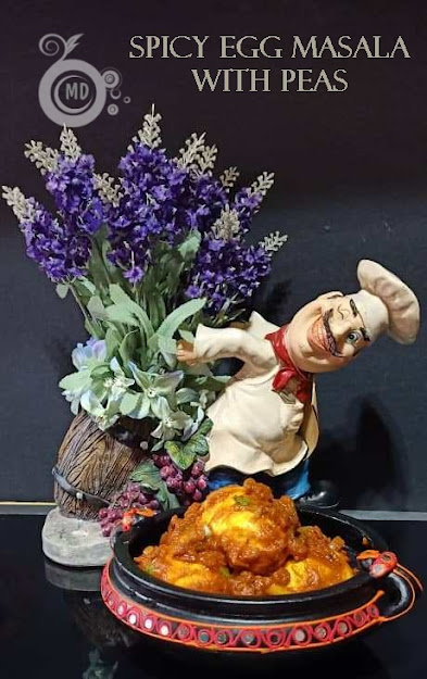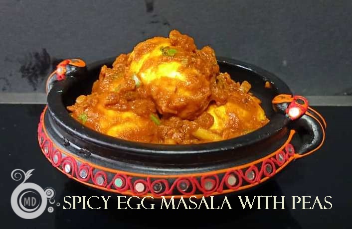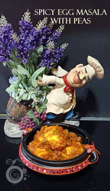 In a skillet or non-stick pan, heat 3 tbsp oil. Add in the spices (cloves, dried chillies, cumin seeds, cardamom, cinnamon stick). Stir fry for a few seconds, then add in chopped onions. Saute until light brown then mix in ginger garlic paste and stir further for another few seconds until aromatic. Mix in the tomato puree, freshly ground tomato puree and slitted green chilli. Stir well to combine. Then, slowly, add in the powders, one by one, and stir well to combine. If too dried, add another tbsp of oil and fry the masala slightly. You need to do this in order to ensure the raw smell and taste of the masalas are eliminated. Then add in 2 cups of hot water. Add in the green peas. Stir well and simmer gently. Once the gravy thickens a bit, mix in the eggs. Finalize by adding in garam masala, salt to taste and chopped coriander leaves.