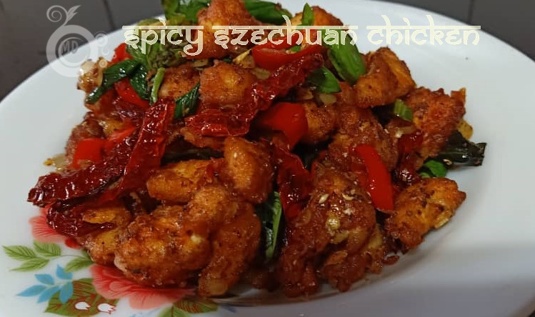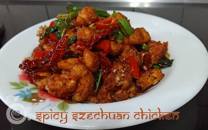Heat a wok, add in 3 tbsp oil (You can use the same oil which you had used for frying the chicken). Throw in the dried chillies, followed by onions. Once the onions had browned, add in garlic and saute for a few seconds. Throw in the fried chicken pieces into the mixture. Mix in the green and red chillies, followed by the Szechuan peppercorns, cooking wine and basil leaves. Stir in a fast mode on high heat. Add in sugar and salt to taste and immediately close fire and serve with white rice.