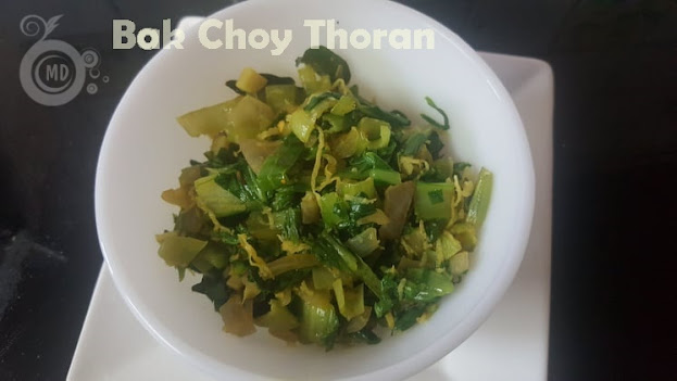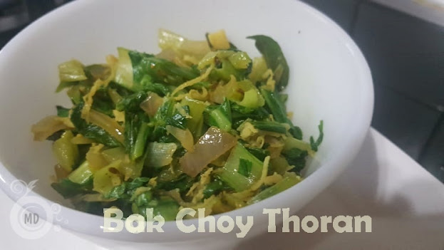 (separate the chopped leaves and the stems) 1 medium-size onion, chopped 2 nips garlic, chopped a few slices of green chillies 1/2 tsp turmeric powder 1 sprig curry leaf 1/4 tsp cumin seeds 1 tsp grated coconut salt to taste Heat wok with 1 tbsp oil. Saute onion and garlic until aromatic. Add in the stems of the bok choy and stir fry for a minute. Then add in green chillies and the leaves. Add in turmeric powder. Stir well for all the ingredients to mix well. If dish too dry, you can sprinkle some water. Add in cumin seeds and salt to taste and cook for a few seconds. Finally, add in grated coconut and curry leaf. Stir well and cook for a few seconds. Close fire. Serve as a side dish with rice.
