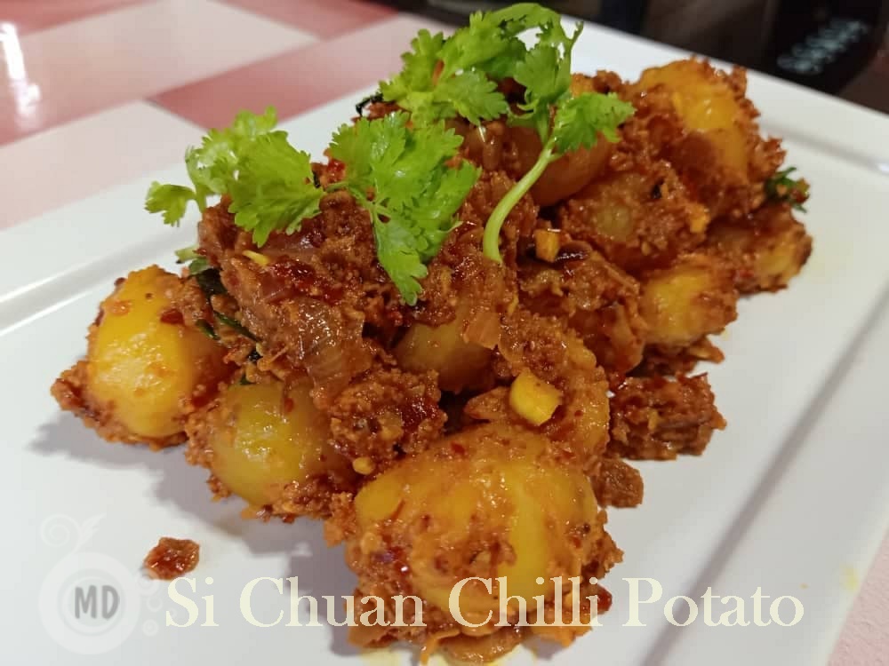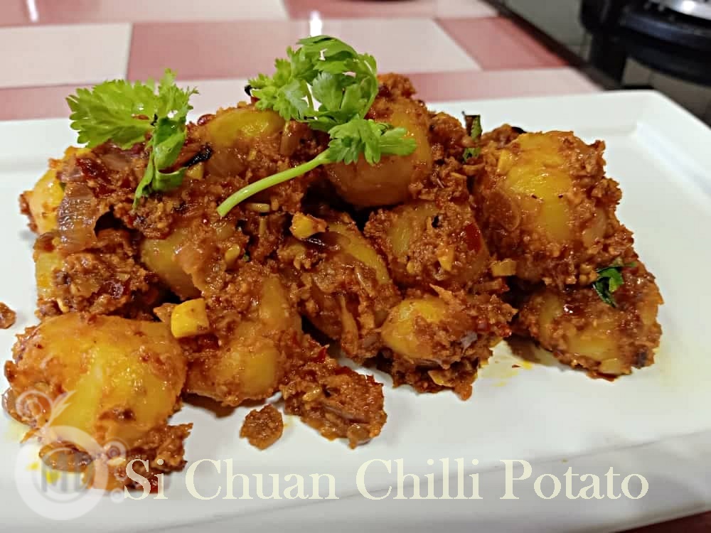 Heat about 2 tbsp oil, saute onions. Once aromatic add in chopped garlic and saute further. Add in boiled potatoes and stir well to coat them with the spices. Add in Si Chuan sauce and tomato puree. Stir well to combine. Then mix in the ground coconut. Mix well and leave for a minute or so. Add salt to taste. Throw in curry leaf and coriander leaves. Dish out and serve with rice or chapati.